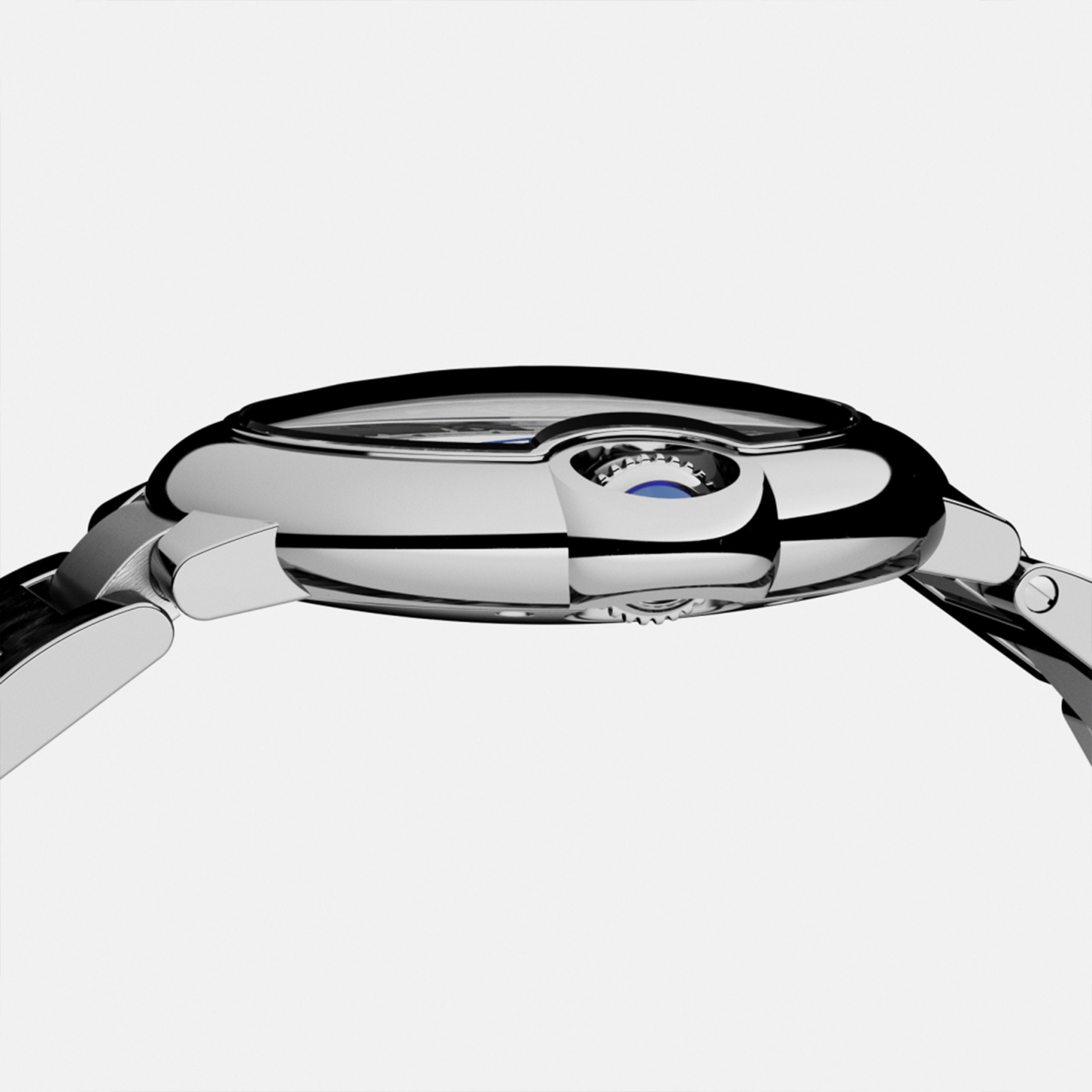 To blend volume and curves, its crystal sapphire is domed and completely integrated into the case.